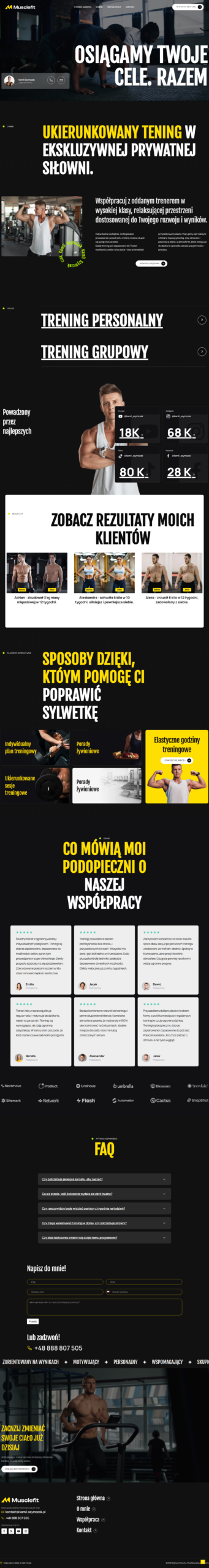 Strona buduje Twój wizerunek jako specjalisty, nie „trenera z siłowni”.Pokazujemy specjalizację, efekty klientów, proces pracy i jasno określoną niszę (np. przedsiębiorcy, sportowcy, klienci premium). To daje Ci przewagę i pozwala skalować działalność.